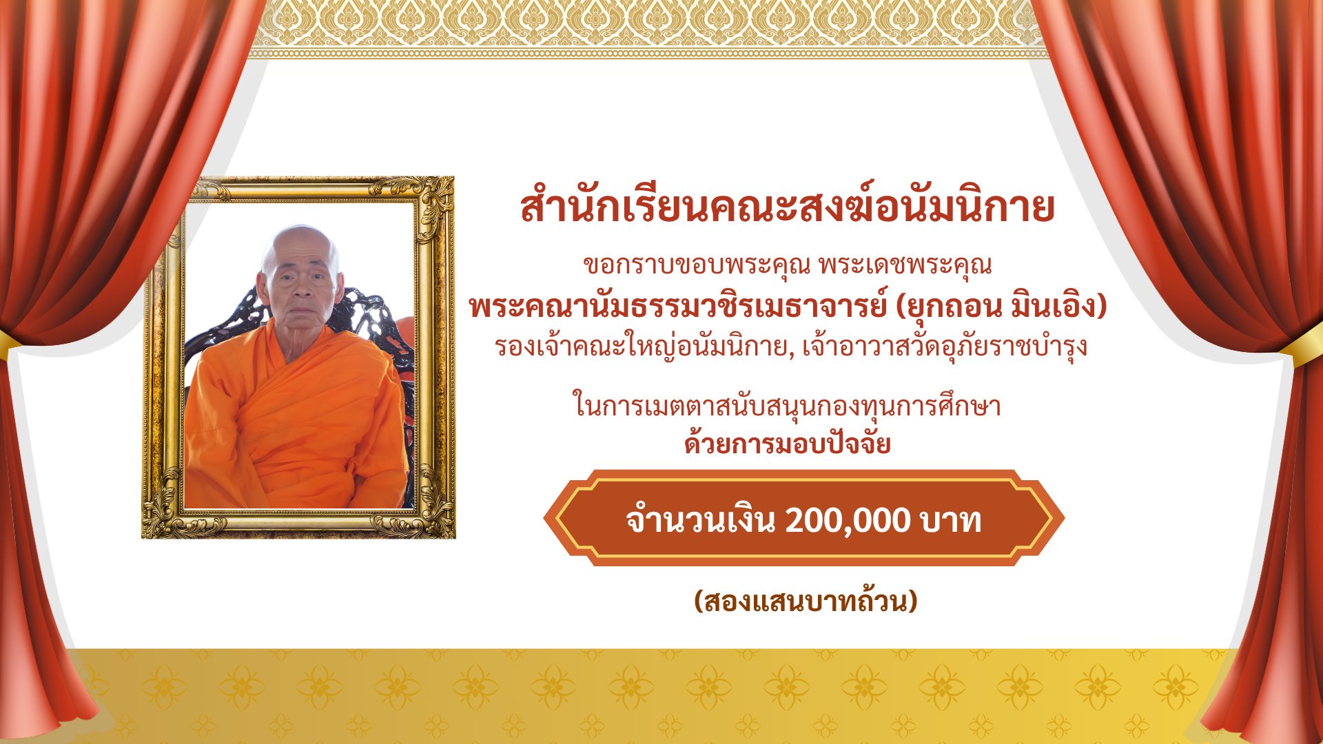 ขอกราบขอบพระคุณในความเมตตาของ พระเดชพระคุณ พระคณานัมธรรมวชิรเมธาจารย์ (ยุกถอน มินเอิง)รองเจ้าคณะใหญ่อนัมนิกาย, เจ้าอาวาสวัดอุภัยราชบำรุง ที่ได้เมตตามอบปัจจัยสนับสนุน "กองทุนการศึกษา" แด่ สำนักเรียนคณะสงฆ์อนัมนิกาย เป็นจำนวนเงิน 200,000 บาท (สองแสนบาทถ้วน)